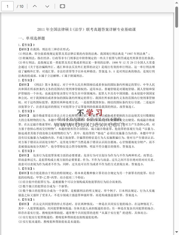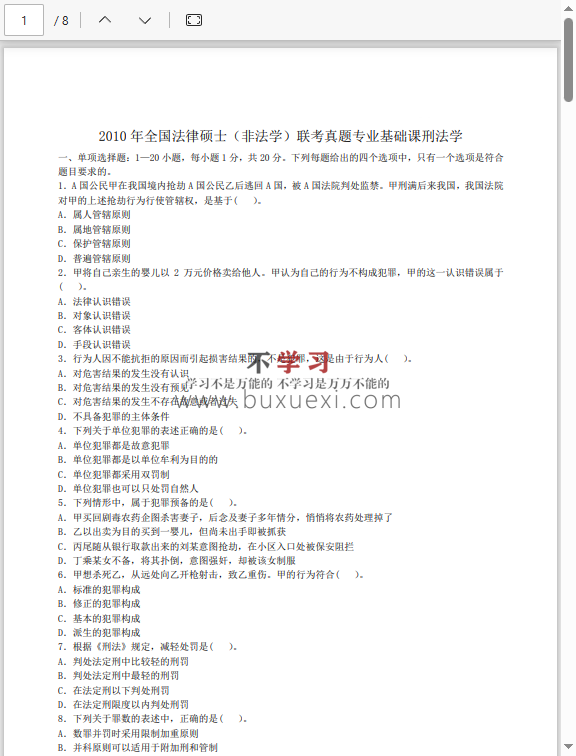 《法律硕士历年真题》是一部专门为法律硕士考生准备的复习资料,涵盖了2010年至2025年间的真题,文件大小为560.22MB。对于那些希望在法律领域深造的学子来说,这本书无疑是个宝贵的资源。 首先,这本书汇集了多年法律硕士入学考试的真题,能够帮助考生深入了解考试的出题方向和难度。每一道题目都代表了当时的考试趋势,可以让考生在备考过程中更有针对性地进行复习。 其次,书中的真题不仅涵盖了核心的法学知识,还涉及到法律实践中的实际问题。这种理论与实践的结合使得考生能够更好地理解法律概念,并在考试中灵活运用所学知识。 再者,考虑到书名中提到的“非法学”背景,这本书同样适合那些没有法律专业背景的考生。它通过整理和分析历年的真题,帮助非法律专业的考生更快速地掌握必要的法律知识,提升自己的应试能力。 此外,书中还提供了详细的解题思路和答案解析,帮助考生理清答题思路,掌握答题技巧。这对于初次接触法律知识的考生来说尤为重要,能够大大提升他们的自信心和应试能力。 总之,《法律硕士历年真题》是一本非常实用的复习资料,适合所有希望进入法律硕士研究生阶段的考生。通过对历年真题的研究和分析,考生可以更有效地备战考试,提升自己的法律素养,为未来的法律职业生涯打下坚实的基础。